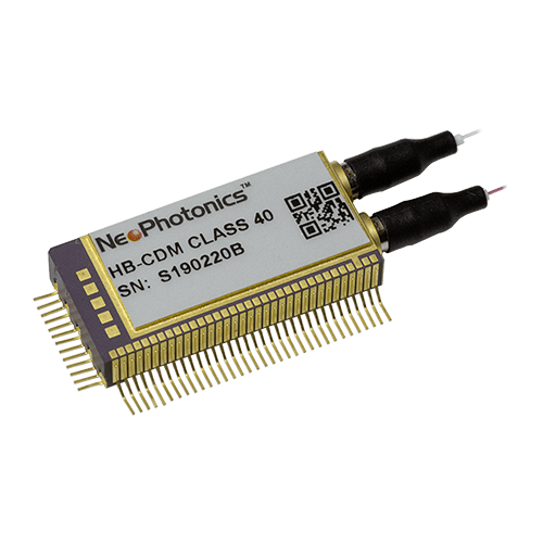 The Neophotonics High-Bandwidth Coherent Driver Modulator (HB-CDM) is a cutting-edge product for high-end communications networks, providing the functionality of a high performance coherent modulation in a small form-factor (OIF standard). It takes a polarized input (PMF fiber, light injected on fast axis) and splits the light over two polarization paths and adds phase modulated coding, typically DP-QPSK or QAM. It then combines the light into one fiber (SMF) for transmission over long distance networks.